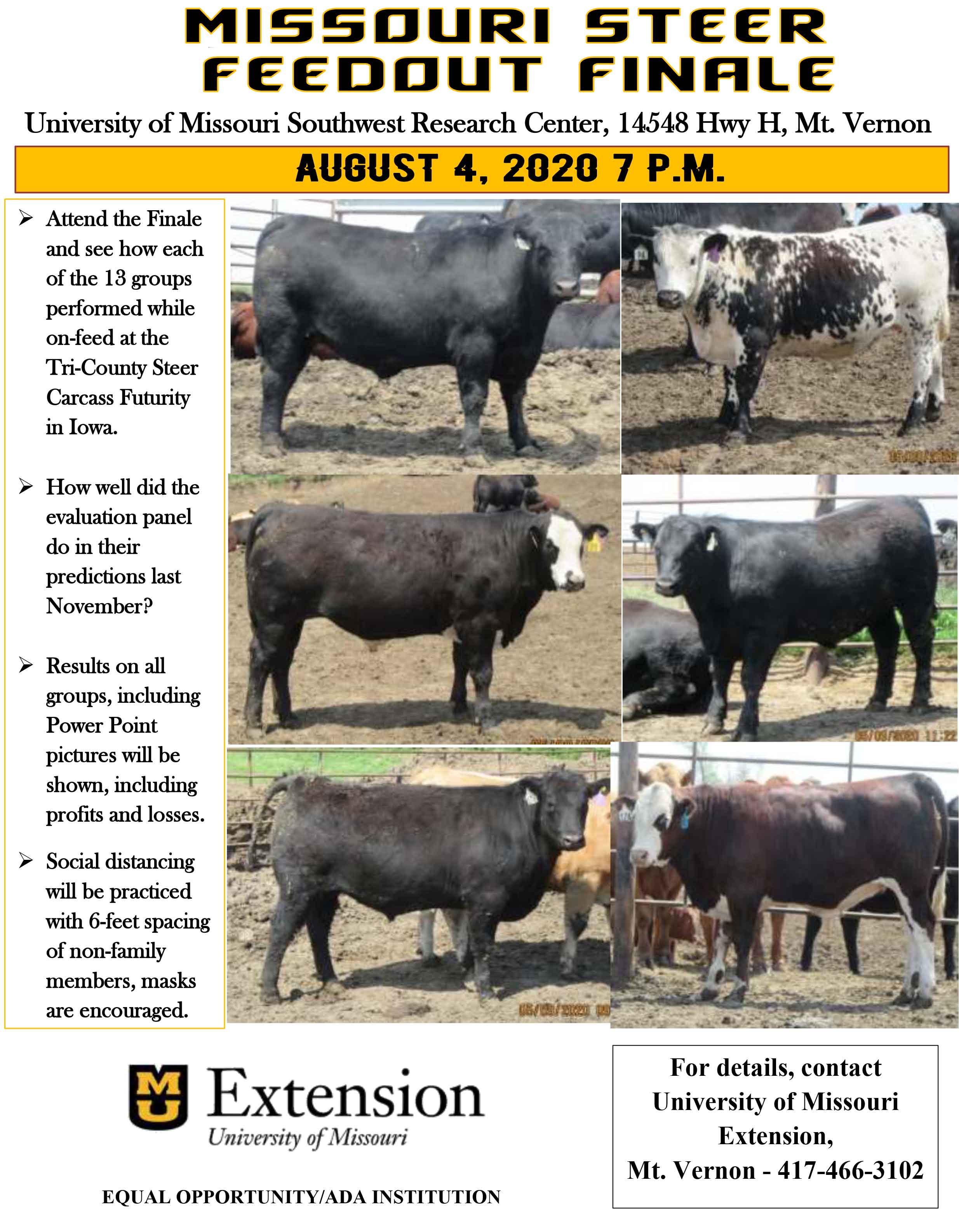 2020 Missouri Steer Feedout - The feedout will be held in cooperation with the Tri-County Steer Carcass Futurity (TCSCF) Lewis, Iowa. Seven different feedlots participate and Iowa State extension personnel supervise the program along with the TCSCF board. Past Missouri Steer Feedouts Missouri Steer Feedout Finale July 2, 2019 Missouri Steer Feedout Program 2017-2016 Brochure